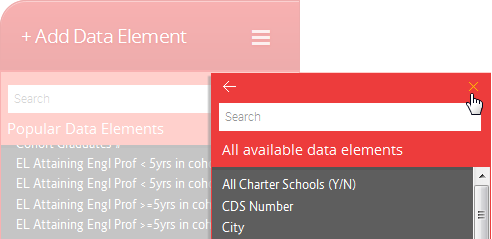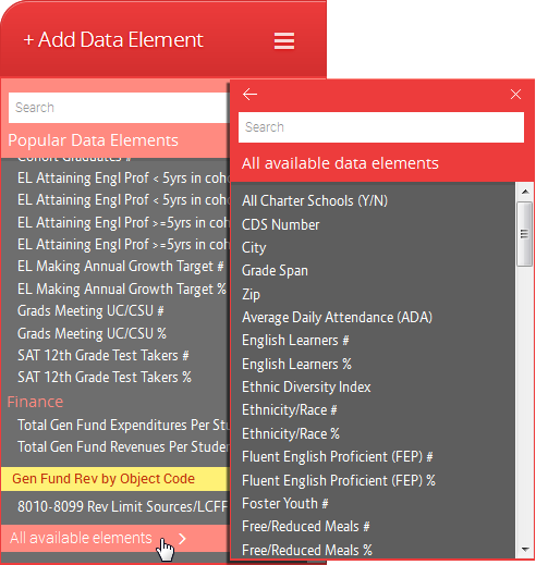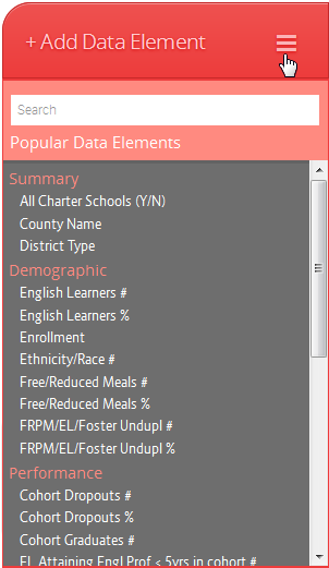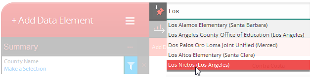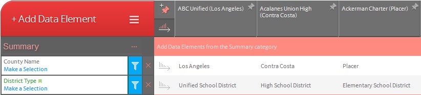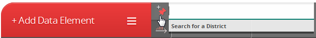 You can add a specific district to the district comparisons or a specific school to the school comparisons by clicking on the pin with a “+” sign next to “Add Data Element”: