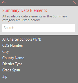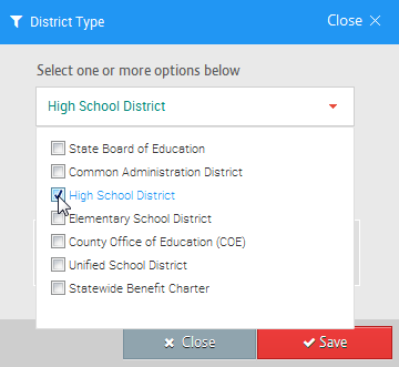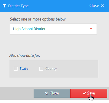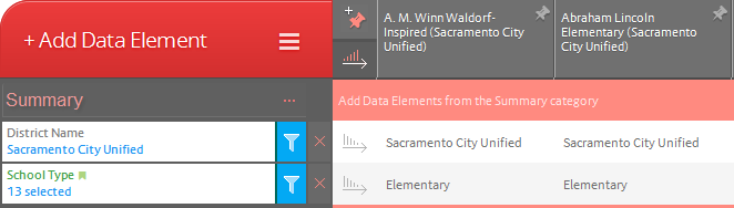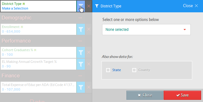 You can narrow your results by filtering data elements. For example, if you only want to look at high school districts, you would go to the District Type data element and click on the funnel icon: