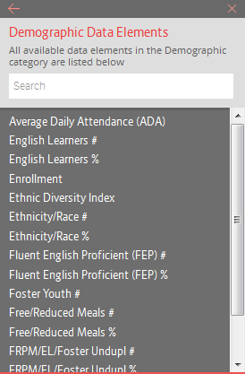 - Select the data elements to be included in the comparison results from a list of all fields or by data category (e.g., summary, student demographic, performance, finance)