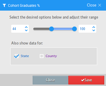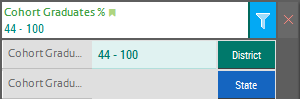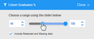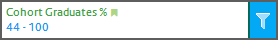 For data elements with a large range from low to high, like enrollment, it is best to just type in the low or high number you want. For data elements with a smaller range from low to high, you can grab the button on either end of the slider and drag it to the number you want. For example, to filter on cohort graduation rates between 44% and 100%, you can slide the button near zero to 44: