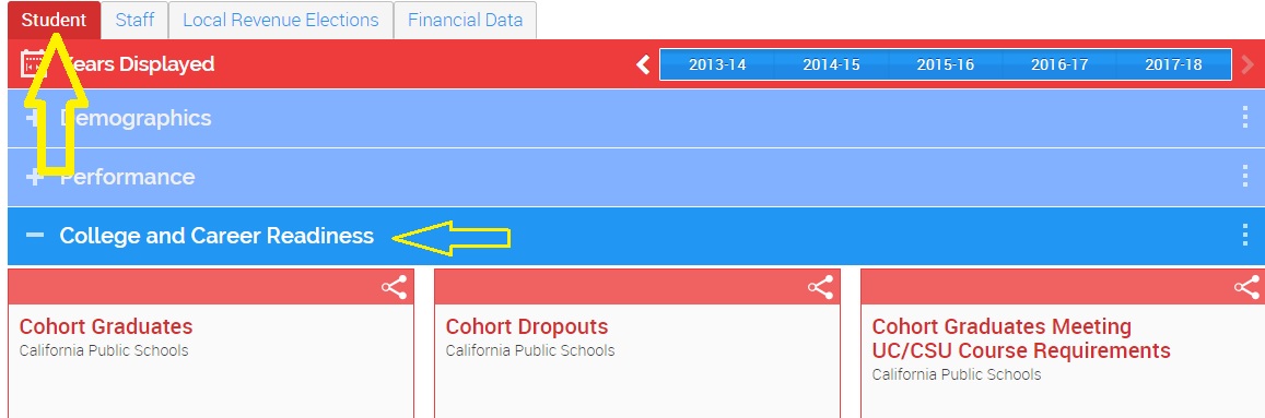 In response to changes in 2016 to how the state collects and reports 4-year cohort graduation and other outcome data, Ed-Data created three new sets of graphs to present richer experiences when you view graduation, dropout or UC/CSU eligibility data. These graphs are available at the school, district, county and state level in the College and Career Readiness section of the Student tab.